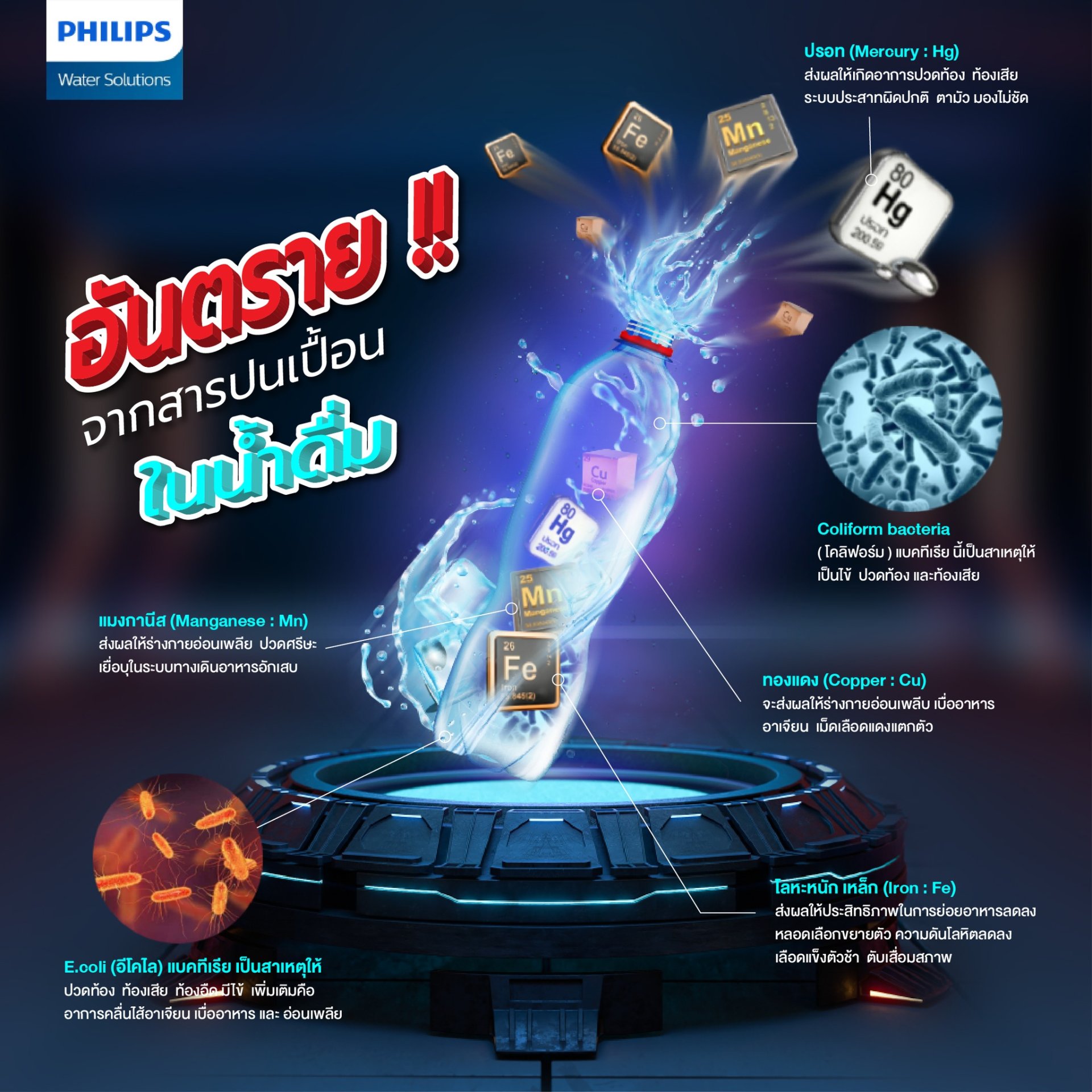 คุณรู้หรือไม่ว่า “น้ำ” ที่เราใช้บริโภคและอุปโภคอยู่ในทุกๆวันนั้น อาจทำให้เกิดโรคได้ สาเหตุที่เกี่ยวข้องอาจมาจากการปนเปื้อนของสารอันตรายที่อยู่ในน้ำ มีโรคที่สามารถเกิดขึ้นจากน้ำที่ปนเปื้อนสามารถแพร่โรคได้หลากหลาย เช่น โรคท้องร่วง อหิวาตกโรค โรคบิด ไทฟอยด์ และโปลิโอ สารที่เป็นอันตรายได้แก่
