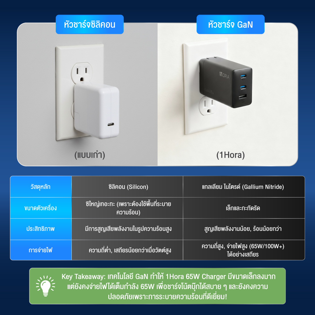 วันนี้เราจะมาทำความรู้จักกับนวัตกรรมเปลี่ยนโลกอย่าง "หัวชาร์จเร็ว 65W เทคโนโลยี GaN" จาก 1Hora ที่จะช่วยให้คุณพกพาได้ง่ายขึ้น ชาร์จได้เร็วขึ้น และที่สำคัญที่สุดคือ ปลอดภัย ทั้งกับมือถือและโน้ตบุ๊ก!