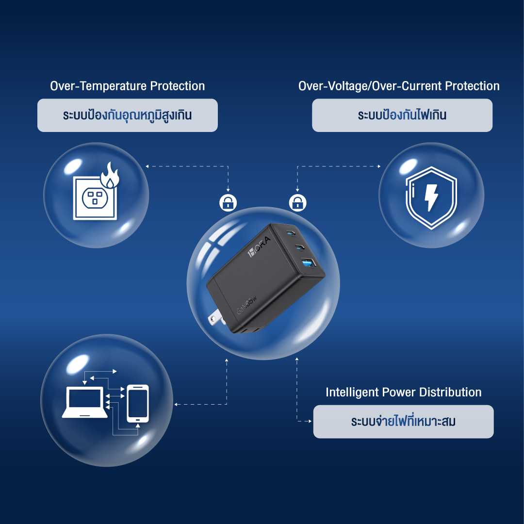 - ระบบป้องกันอุณหภูมิสูงเกิน (Over-Temperature Protection) : ตรวจสอบและลดกระแสไฟทันที หากพบว่าหัวชาร์จมีความร้อนสูงเกินไป ซึ่ง GaN ช่วยลดความร้อนพื้นฐานได้อยู่แล้ว ทำให้ระบบป้องกันทำงานได้อย่างมีประสิทธิภาพ