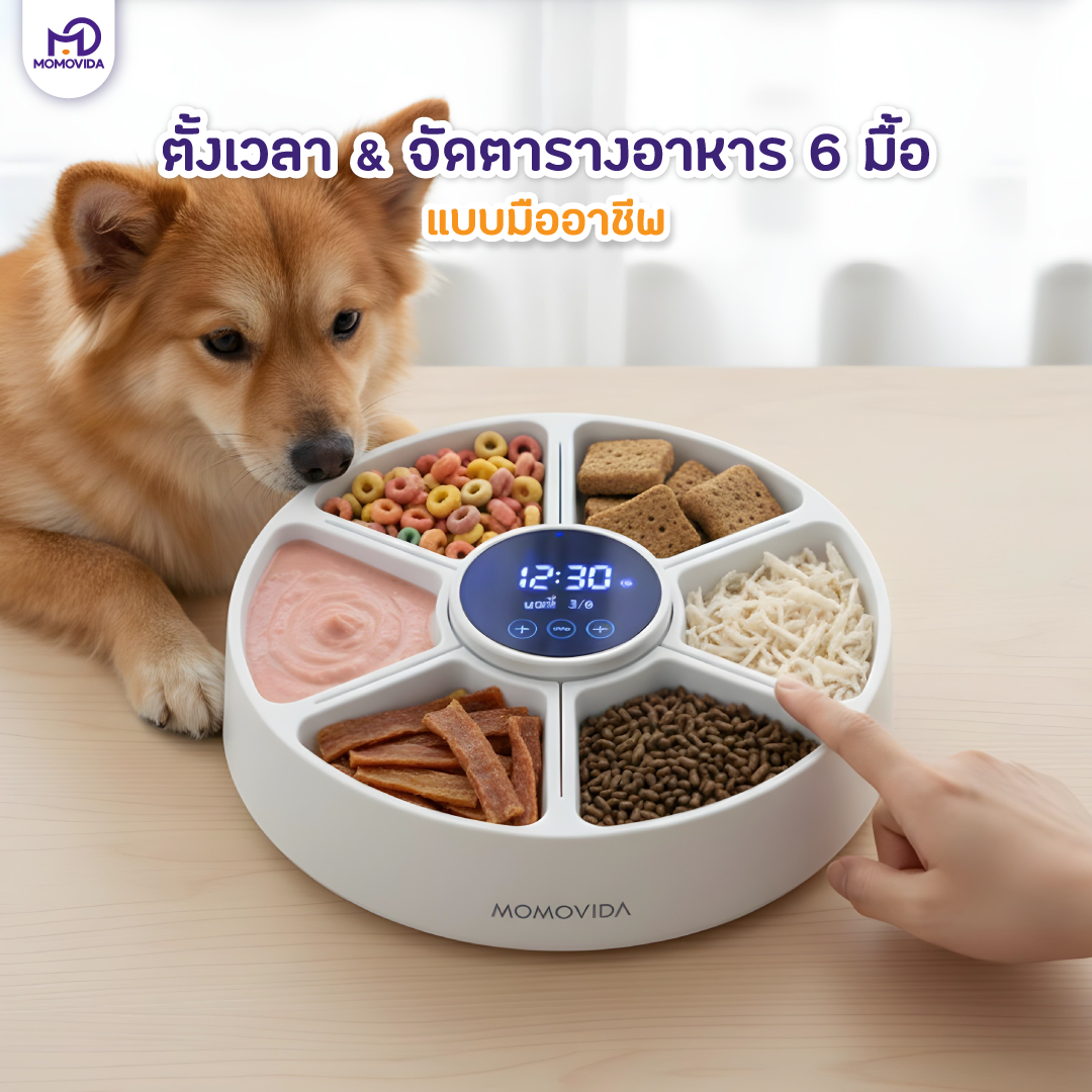 แต่ยุคนี้ ปัญหาเหล่านั้นจบแล้วครับ! ผมขอแนะนำฮีโร่ตัวใหม่ล่าสุด ที่มาพร้อมฟีเจอร์จัดเต็มเพื่อความสบายใจของเจ้าของและการกินอย่างมีความสุขของน้อง ๆ นั่นก็คือ MOMOVIDA 6 Meals Automatic Pet Feeder (รุ่น PF-01)!