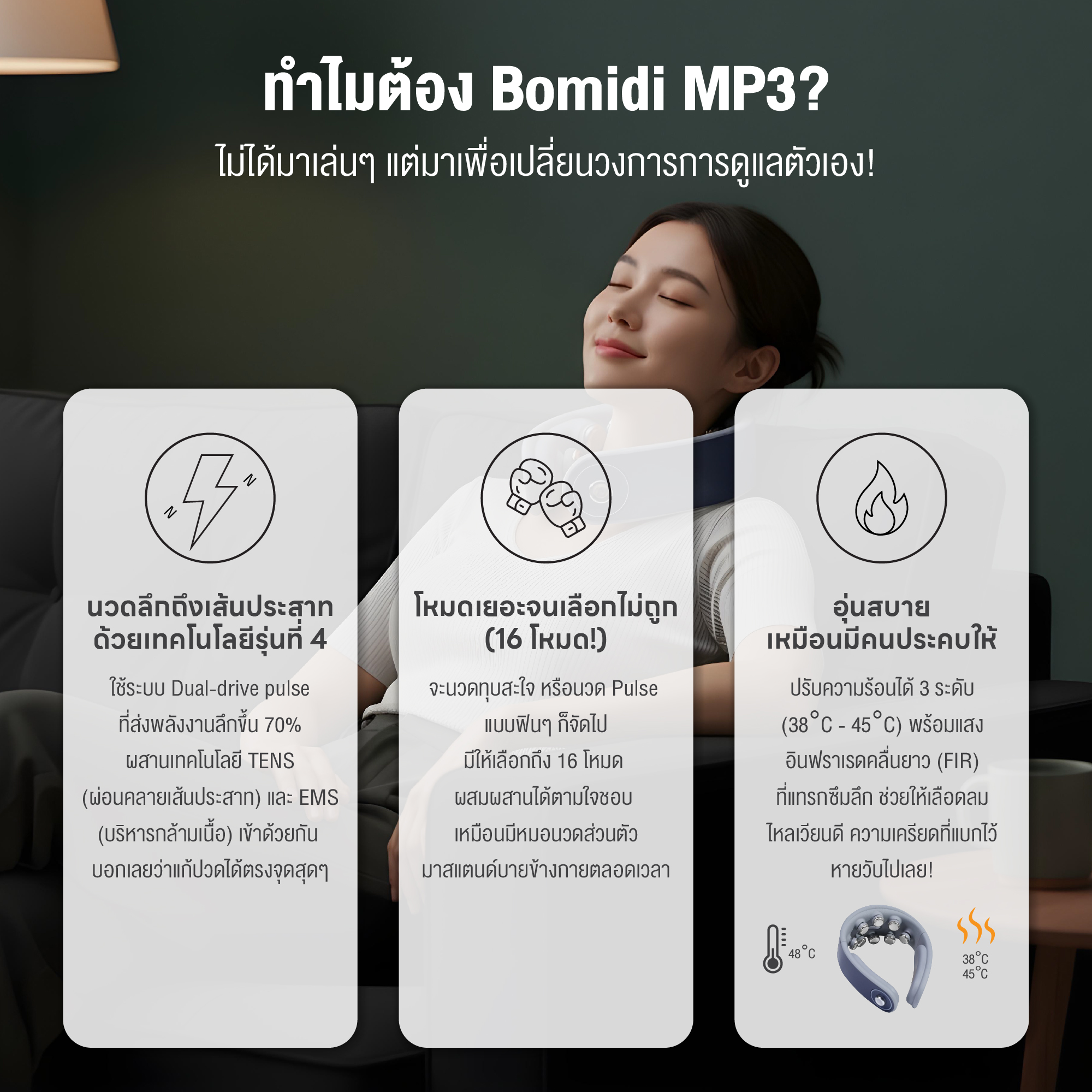 การลงทุนกับสุขภาพไม่ใช่เรื่องฟุ่มเฟือย โดยเฉพาะกับไอเทมที่ออกแบบมาเพื่อไลฟ์สไตล์คนรุ่นใหม่แบบนี้ Bomidi MP3 ไม่ได้แค่ช่วยนวด แต่ช่วยให้คุณมี "Quality Time" เล็กๆ ในวันอันแสนวุ่นวาย น้ำหนักเบา กันเหงื่อระดับ IPX5 ใส่เดินไปไหนก็คูล!