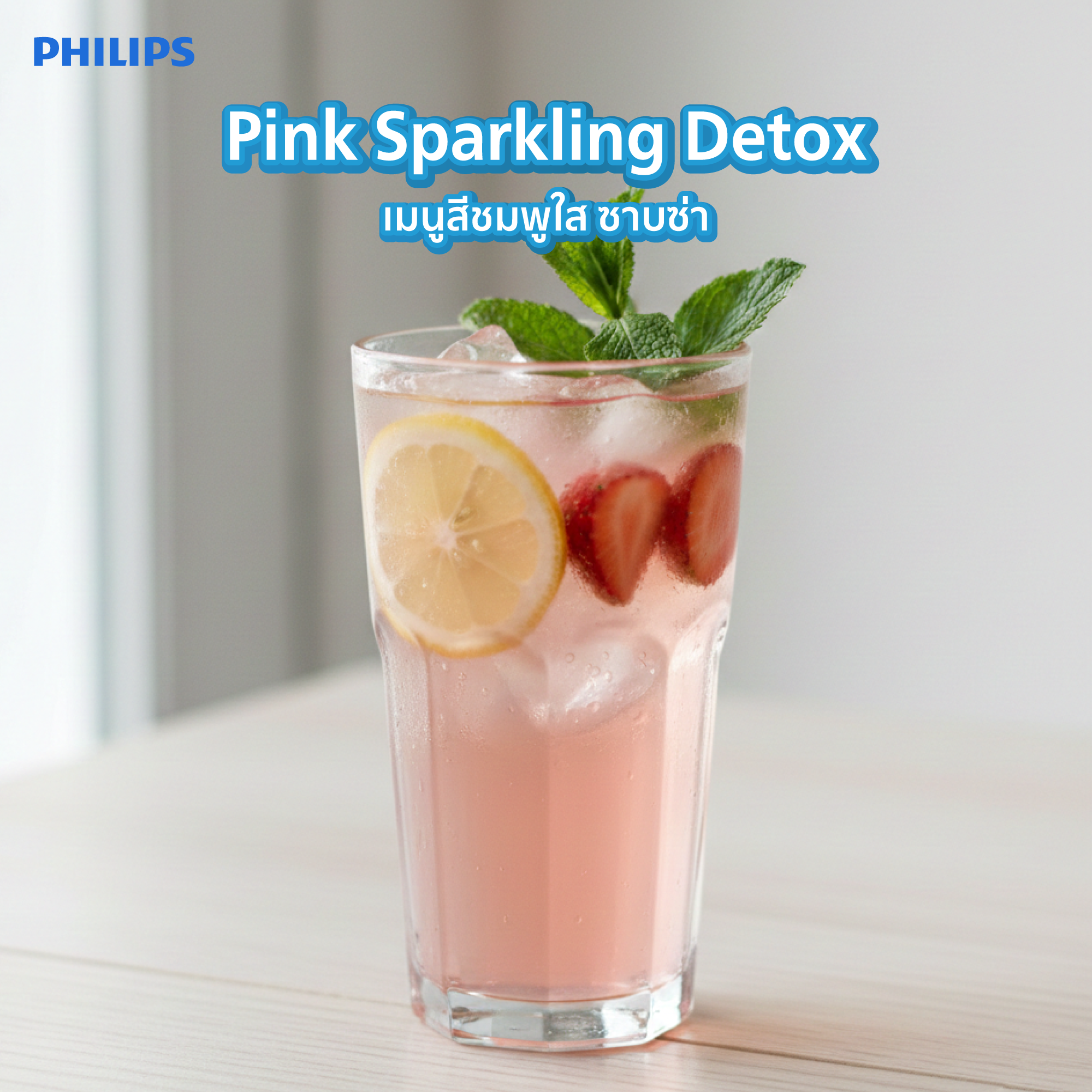 เติมความสดชื่นด้วยน้ำกรองสะอาดจาก Philips Water ผสมกับน้ำเลมอนและเนื้อสตอเบอร์รี่สด