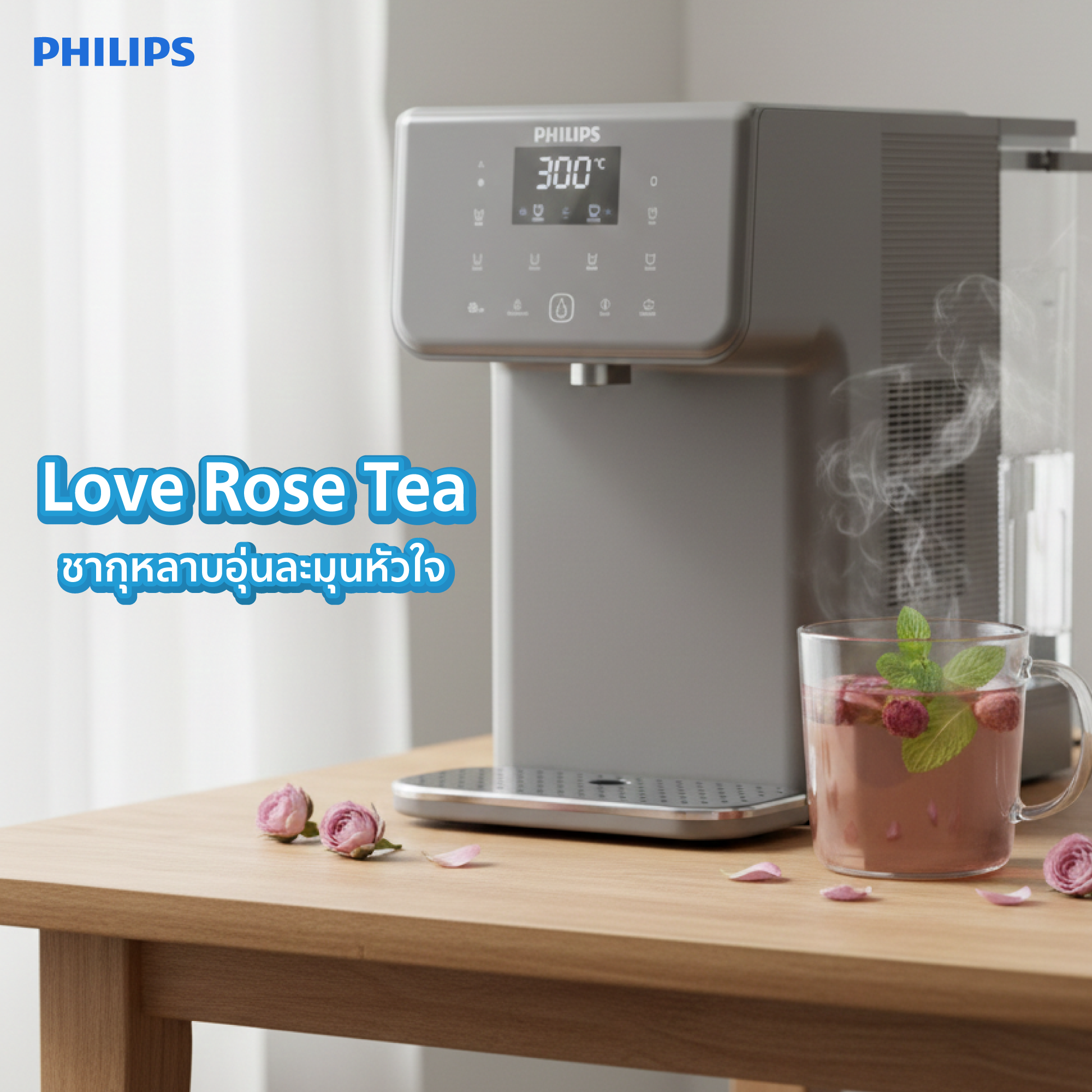 เลือกใช้กลีบดอกกุหลาบออร์แกนิกชงกับน้ำร้อนที่อุณหภูมิ 85°C จากเครื่องกรองน้ำ ระบบทำความร้อนฉับไวของ Philips
