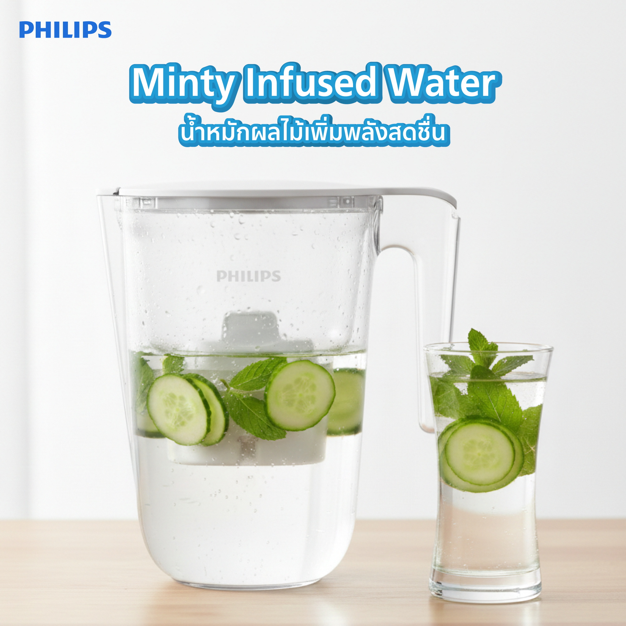ใส่ใบมิ้นท์สดและแตงกวาลงในเหยือกกรองน้ำ Philips Water Filter Pitcher แช่เย็นทิ้งไว้ 1 คืน